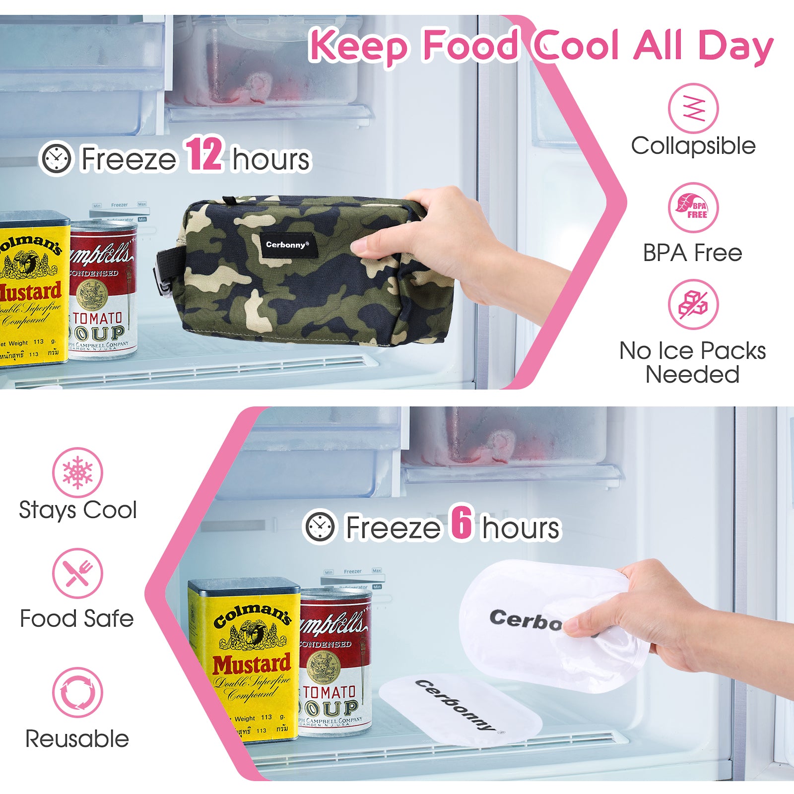 ⛄2 Ways Frozen: 1 Collapse and freeze the small lunch bag overnight (12 hours), 2 Just freeze the gel packs(6 hours) horizontal before putting back into the small insulated bag, instead of freezing entire bag that save freezer space and time. The 2 ways can keep food cool or fresh longer. Ideal for travel/picnic/work/school/adventure.